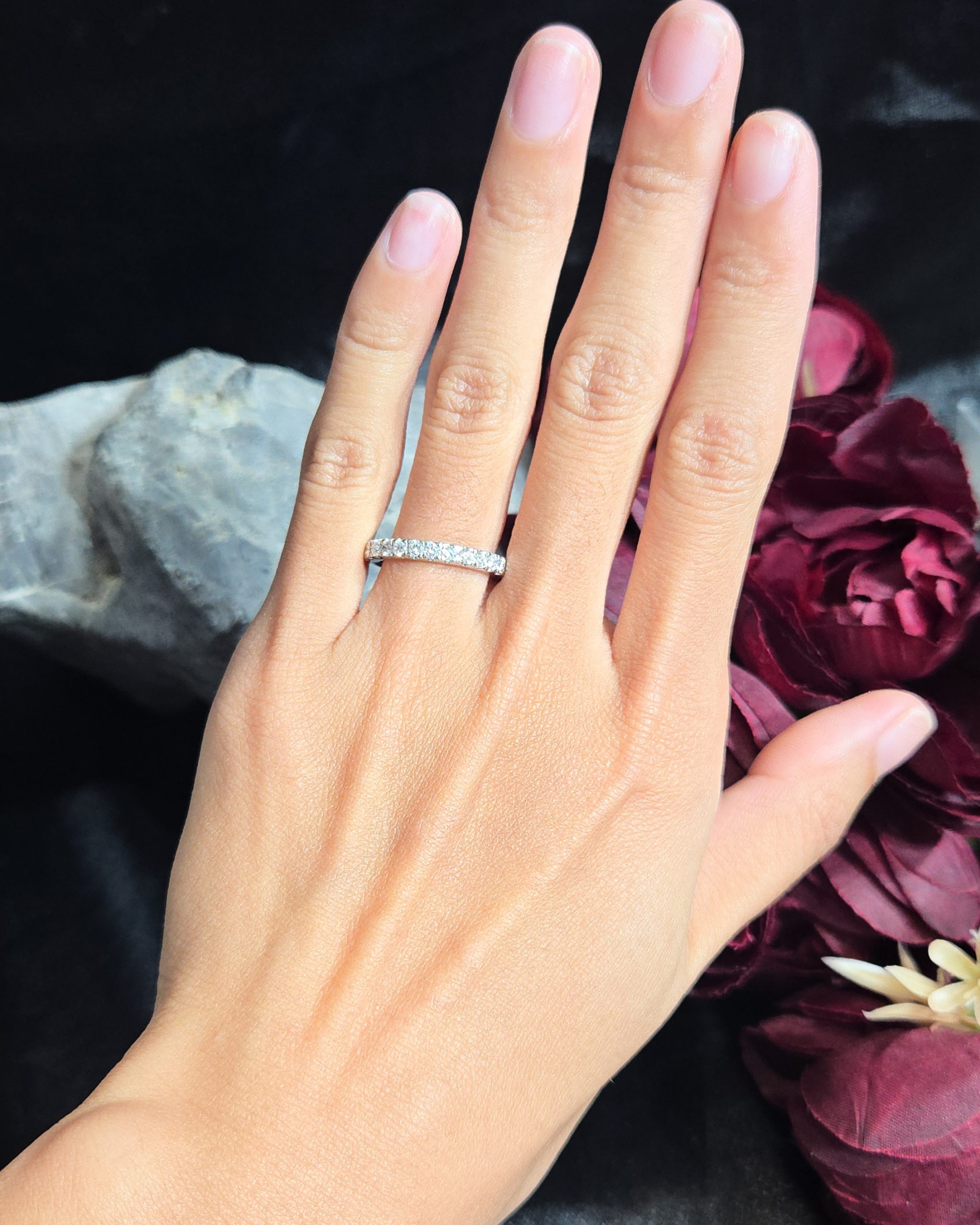 15 pcs (approx.) .03 Carat Round Cut Diamonds (VSI-SI Clarity; GH Color) Width: 2.4mm Thickness: 1.7mm Ring Size: 4.5 (Can be resized half size bigger and half size smaller) Metal: Platinum PT950 Weight: (approx.) 4.29 grams (LOCAL SETTING) Free one time resizing to a smaller size. Minimal charges will be applied for resizing to … Continued